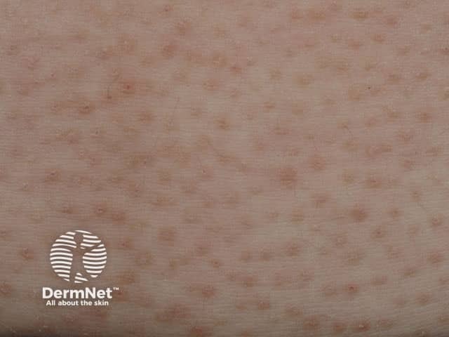 Disseminate and recurrent infundibulofolliculitis typically presents as a widespread, mildly itchy, follicular rash. It has been described as 'goosebumps through a magnifying glass'.