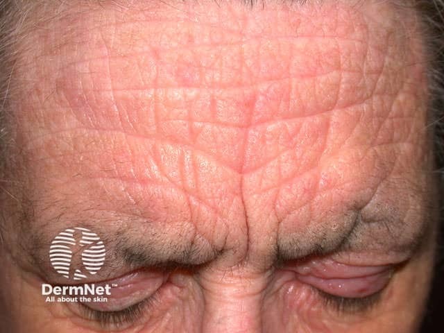 Lichenification and hyperpigmentation in chronic facial atopic eczema (AD-patient7)