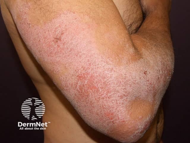 Bilateral erythema, scale and excoriation in atopic limb eczema