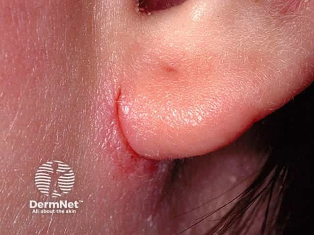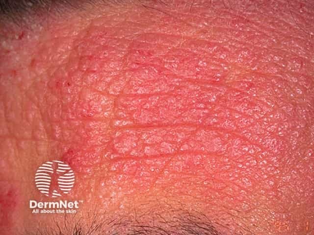 Close-up of erythematous papules and scratch marks in lichenified atopic dermatitis