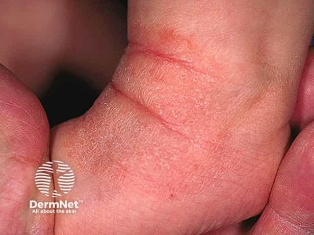 Atopic hand dermatitis involving the volar wrist and palm of hand
