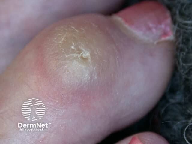 Common skin lesions may arise on the skin close to nails. Benign lesions such as myxoid cyst in the nail matrix area can affect nail growth thus causing a linear depression in the nail plate. Malignant tumours such as squamous cell carcinoma or melanoma can destroy the nail plate.