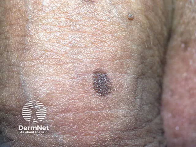 A lentigo is a pigmented flat or slightly raised lesion with a clearly defined edge. Unlike an ephelis (freckle), it does not fade in the winter months. There are several kinds of lentigo.