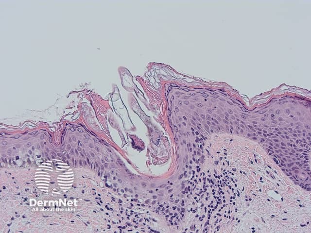 Demodex may be found in mineral oil skin scrapings from the face by KOH examination, or in hair follicles in a skin biopsy examined under the microscope. The superficial part of the horny layer of the skin and the follicular content can also be sampled by skin surface biopsy. Demodicosis is diagnosed when there is a high density of demodex mites (> 5/cm2).