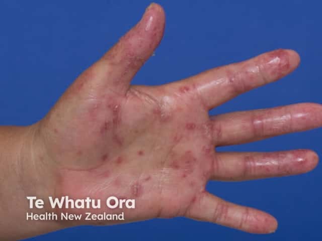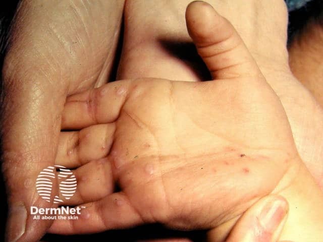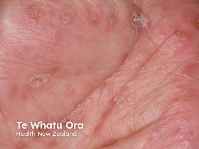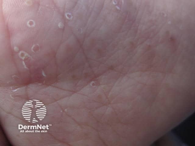 Multiple vesicles and post vesicular scaly patches in palmar hand, foot and mouth disease (HFM-patient4)
