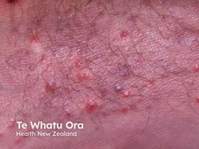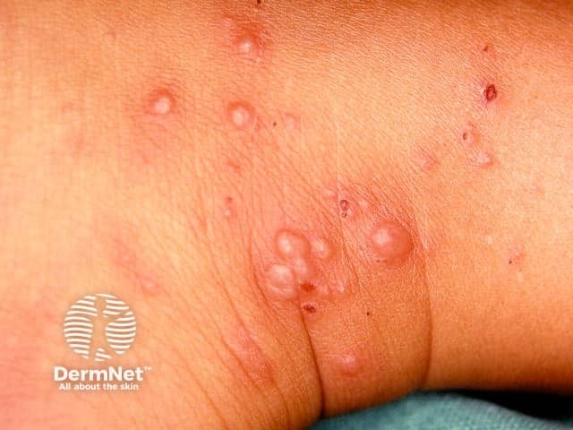 Blisters on the lower leg and antecubital fossa in hand, foot and mouth disease (HFM-patient8)