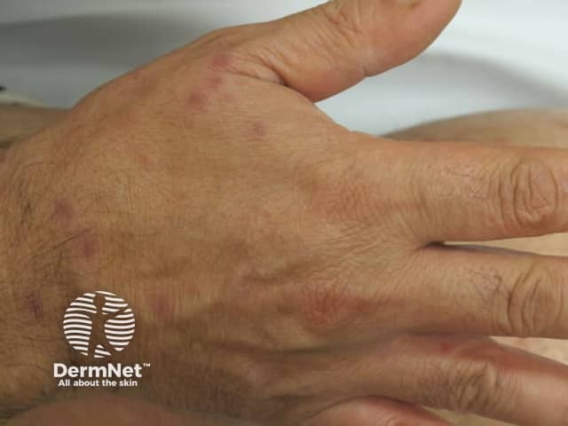 Hand, foot and mouth disease vesicles on the dorsal hands (HFM-patient7)