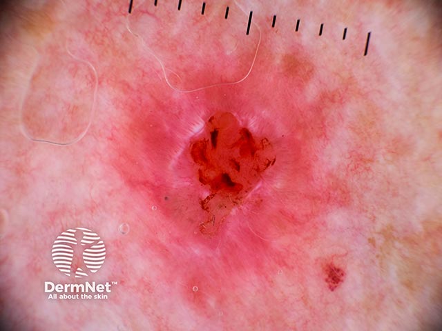 Dried blood obscures many diagnostic dermatoscopic features (BCC-patient19)