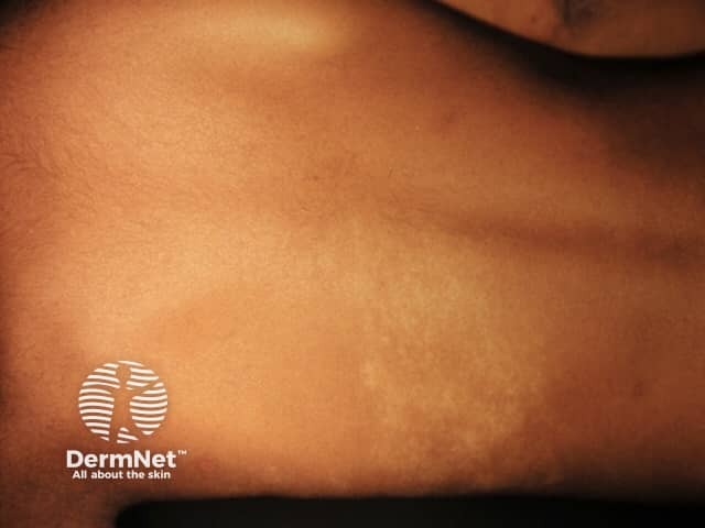 Achromic naevus is usually noted at birth or early childhood, although lesions may not be apparent until mid-childhood in those with light-coloured skin. The naevus remains stable over time apart from growing with the child. Achromic naevus most commonly arises on the trunk, but may also arise on the limbs and elsewhere. It is solitary in 50% of cases and may follow Blaschko lines.