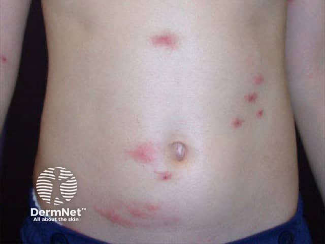 Papular urticaria is a hypersensitivity reaction, most often in a young child due to fleabites and/or mosquito bites. New bites are accompanied by reactivation of old ones and present as symmetrical crops of itchy urticated papules. Papular urticaria resolves with the development of immunological tolerance.