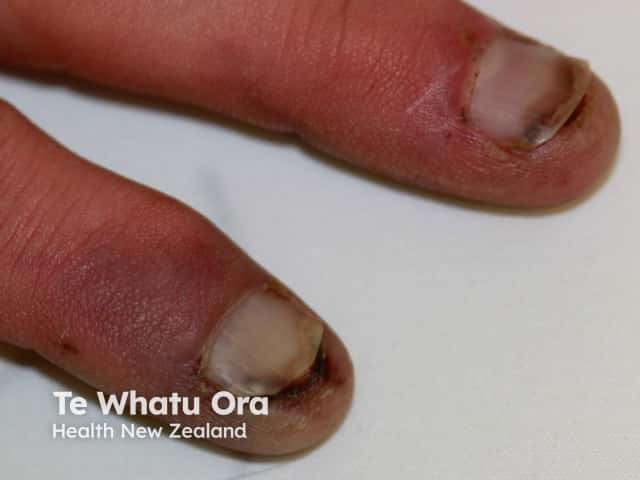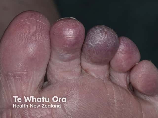 Distal peripheral vascular obstruction presents as blue, grey or purple patches, blisters or ulcers at the ends of the digits. See blue toe syndrome.