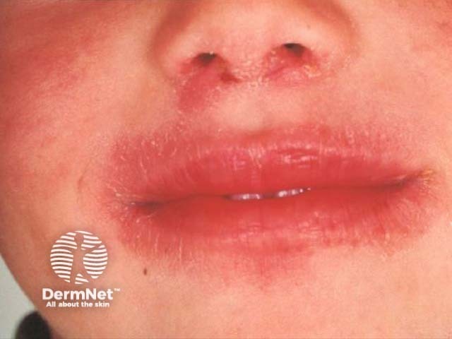 Lip licker’s dermatitis is commonly seen in school-aged children, although it may present at any age [2,3]. In some patients, difficulty with impulse control or cognitive impairment contributes to compulsive lip-licking [4,5].