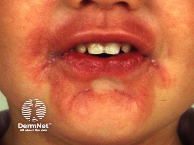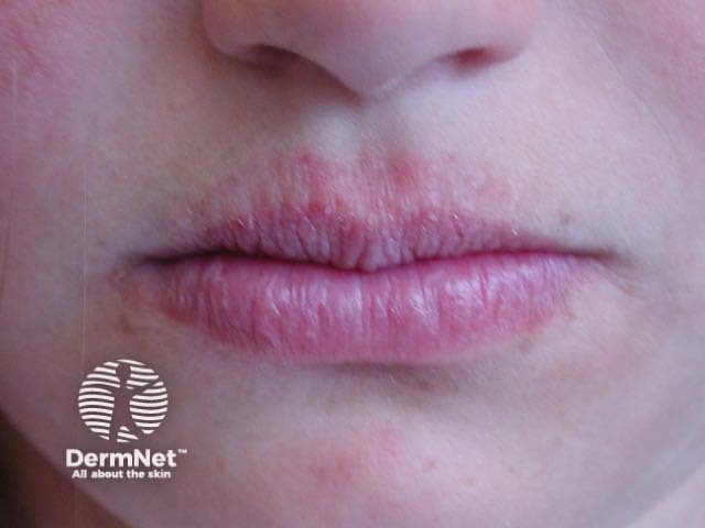 Lip licker’s dermatitis is a reaction of the lips (eczematous cheilitis) and surrounding skin (irritant contact dermatitis) due to contact with an irritating substance — in this case, saliva from the patient’s own tongue [1,2].