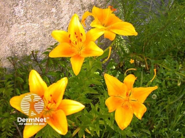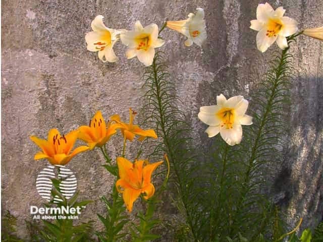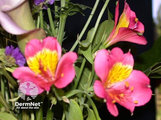 Fingertip Allergic contact dermatitis is caused by contact with recently damaged plants and bulbs, and gives rise to a condition known as tulip fingers. The first case reports of allergic contact dermatitis produced by Alstroemeria species appeared early in the 1970s. Gardeners, florists, and housewives are at most risk. Typically, patients are florists who present with red, thickened and split, tender finger tips of both hands Airborne contact dermatitis has also been reported. This may reflect sesquiterpene lactone sensitivity. More unusually, alstroemeria has been observed to cause depigmentation. A florist developed a sense of throat tightness, allergic rhinoconjunctivitis, urticaria, and facial angioedema attributable to exposure to alstroemeria. For most patients, the allergy leads to a change of profession. |