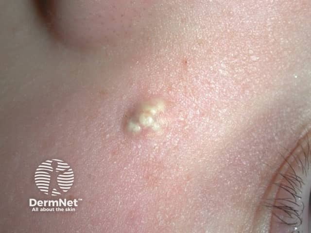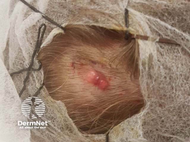 A biopsy will help to establish the cause of the lesion. Alternatively the whole lesion can be removed, providing both diagnosis and treatment. The histology of pilomatricoma is striking. It may show a sharply demarcated tumour surrounded by a fibrous capsule or a poorly demarcated tumour without capsule. There are darkly stained ‘basophilic’ cells and ‘shadow’ cells with missing nuclei. Calcium deposits are found in most lesions.