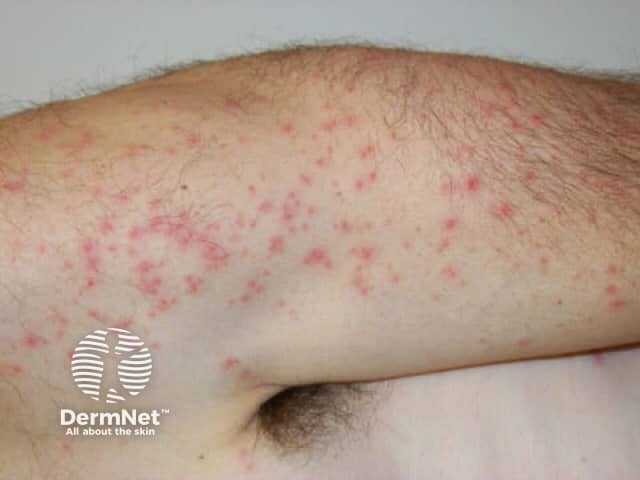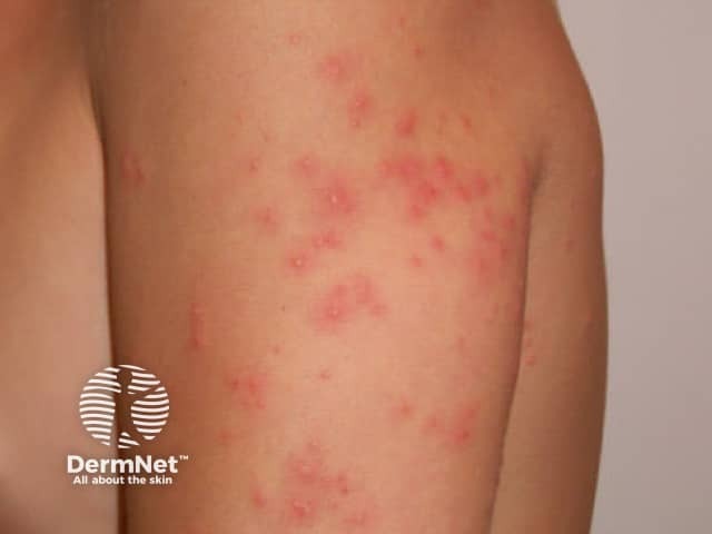 Swimmer’s itch presents within hours of exposure after the film of water has dried on the skin. Initial symptoms are itch or a tingling sensation which settles quickly, leaving tiny red spots where skin penetration by the cercariae has occurred. Intense itch develops over a number of hours and the red spots can enlarge to form papules and, occasionally, hives. Blisters may develop over the next 24 to 48 hours.